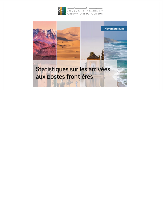 Le Bilan des Arrivées aux Postes Frontières (APF) fournit une analyse détaillée des arrivées touristiques internationales entrant au Maroc. Il inclut l’évolution mensuelle des arrivées ainsi qu’une répartition par pays de résidence et par principaux points d’entrée, offrant ainsi une vision précise des dynamiques du tourisme international.
