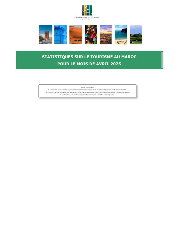 Durant la période de JANVIER à AVRIL 2025, le volume des arrivées de touristes aux postes frontières a atteint environ 5 678 186 de touristes avec une variation de 23 % par rapport à la même période de 2024.