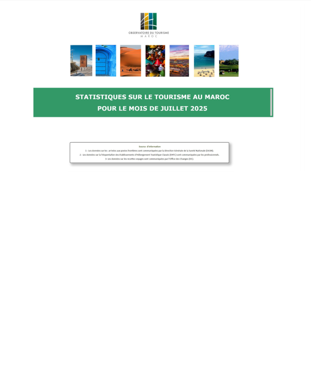 Durant la période de JANVIER à JUILLET 2025, les recettes voyages en devises générées par l’activité touristique des non-résidents au Maroc se sont élevées à 67,143 millions de dirhams contre 59,637 millions de dirhams en 2024, soit une variation de 13 %.