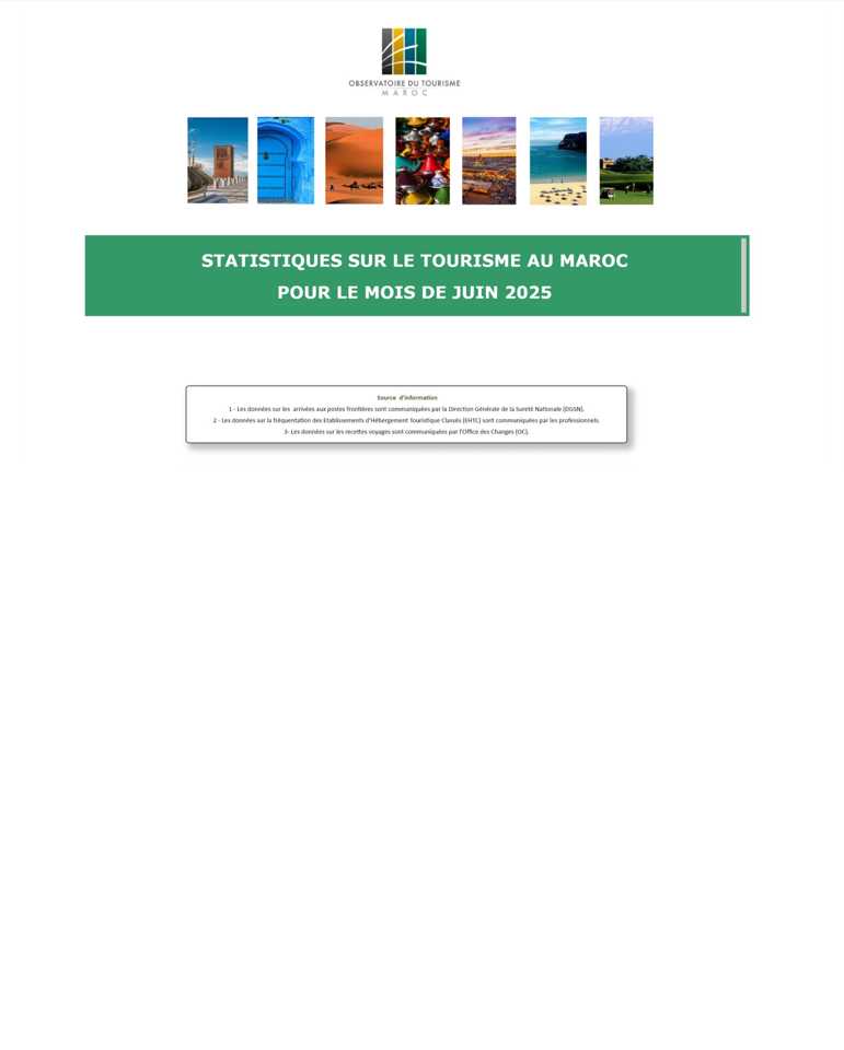 Durant la période de JANVIER à JUIN 2025, le volume des arrivées de touristes aux postes frontières a atteint environ 8 884 396 de touristes avec une variation de 19 % par rapport à la même période de 2024.