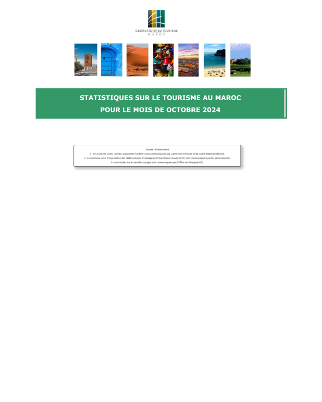 Durant le mois de OCTOBRE 2024, le volume des arrivées de touristes aux postes frontières a atteint 1 499 115 de touristes avec une évolution de 30 % par rapport à OCTOBRE 2023.
